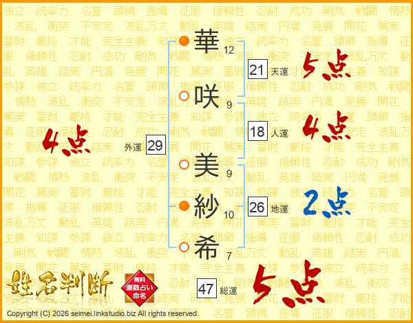 華(12画)咲(9画) 美(9画)紗(10画)希(7画)