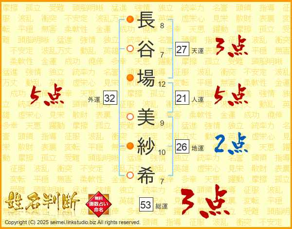 長(8画)谷(7画)場(12画) 美(9画)紗(10画)希(7画)