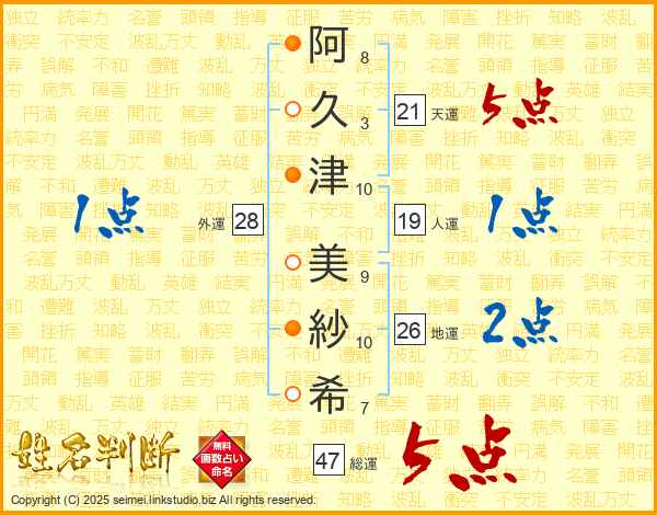 阿(8画)久(3画)津(10画) 美(9画)紗(10画)希(7画)