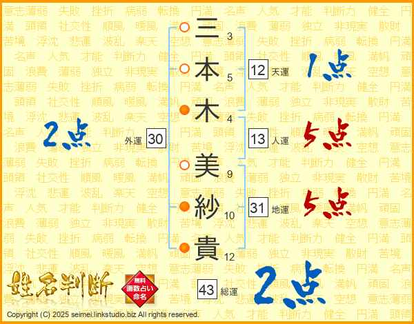 三(3画)本(5画)木(4画) 美(9画)紗(10画)貴(12画)