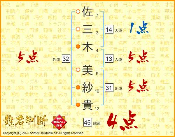 佐(7画)三(3画)木(4画) 美(9画)紗(10画)貴(12画)