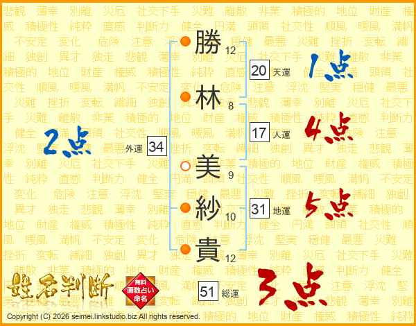 勝(12画)林(8画) 美(9画)紗(10画)貴(12画)