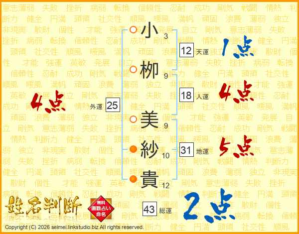小(3画)栁(9画) 美(9画)紗(10画)貴(12画)