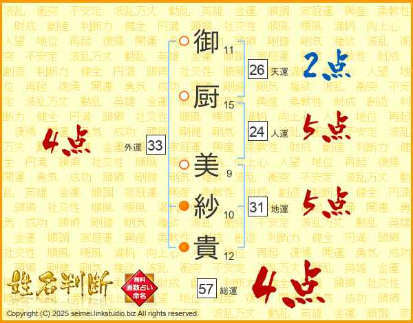 御(11画)厨(15画) 美(9画)紗(10画)貴(12画)