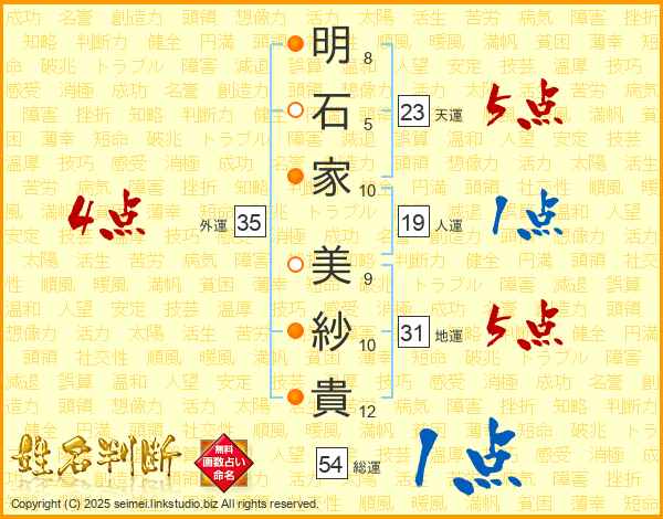 明(8画)石(5画)家(10画) 美(9画)紗(10画)貴(12画)