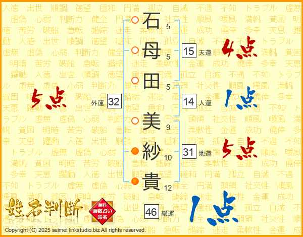石(5画)母(5画)田(5画) 美(9画)紗(10画)貴(12画)