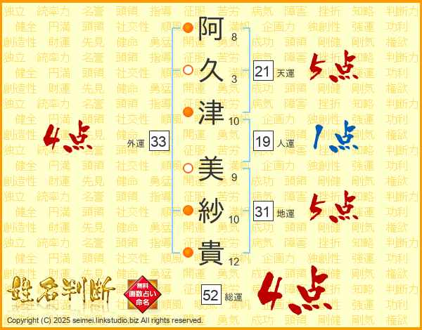 阿(8画)久(3画)津(10画) 美(9画)紗(10画)貴(12画)