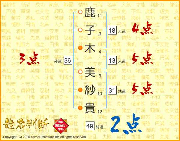 鹿(11画)子(3画)木(4画) 美(9画)紗(10画)貴(12画)