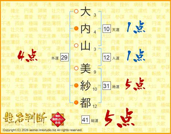 大(3画)内(4画)山(3画) 美(9画)紗(10画)都(12画)