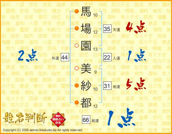 馬(10画)場(12画)園(13画) 美(9画)紗(10画)都(12画)
