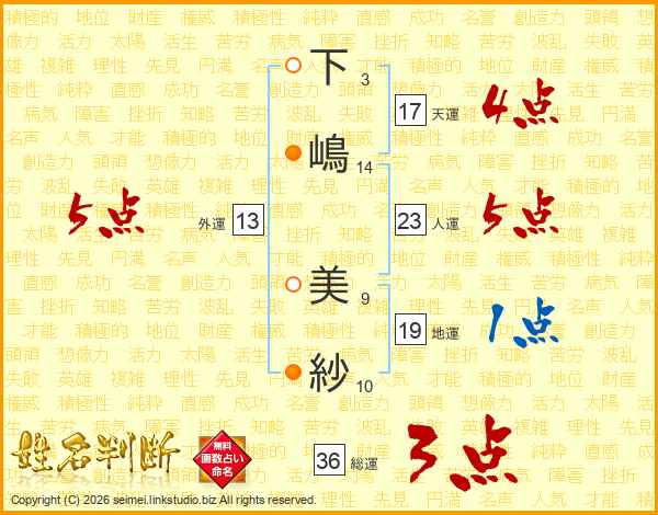 下(3画)嶋(14画) 美(9画)紗(10画)