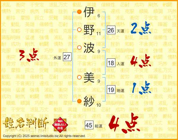 伊(6画)野(11画)波(9画) 美(9画)紗(10画)