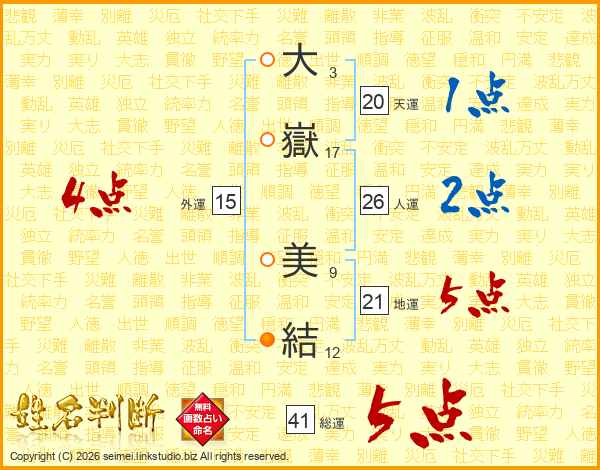 生活面を象徴する運勢です。外部から受ける影響力を表し、結婚運、家庭運や職場、環境への順応性を表します。総運から人運を引いた画数。姓や名が1文字の場合を除く。