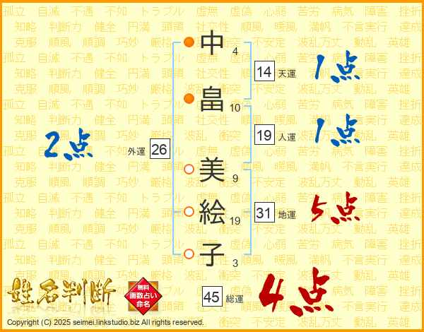中(4画)畠(10画) 美(9画)絵(19画)子(3画)