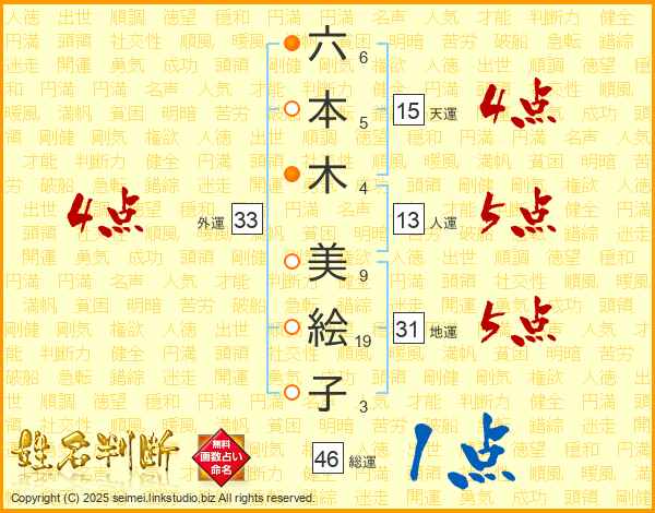 六(6画)本(5画)木(4画) 美(9画)絵(19画)子(3画)
