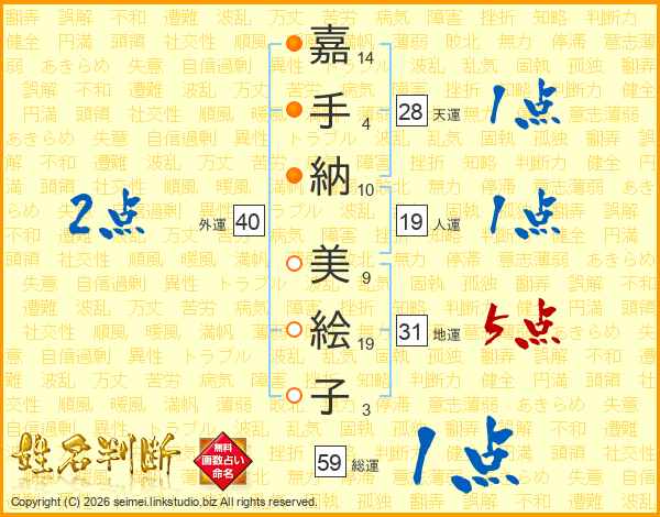 嘉(14画)手(4画)納(10画) 美(9画)絵(19画)子(3画)