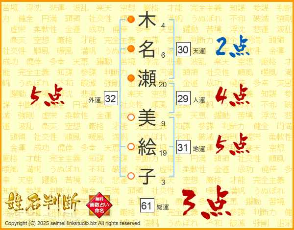 木(4画)名(6画)瀬(20画) 美(9画)絵(19画)子(3画)