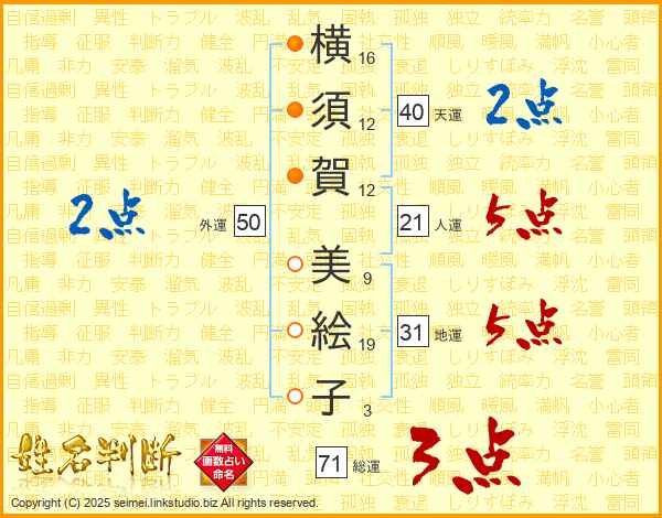 横(16画)須(12画)賀(12画) 美(9画)絵(19画)子(3画)
