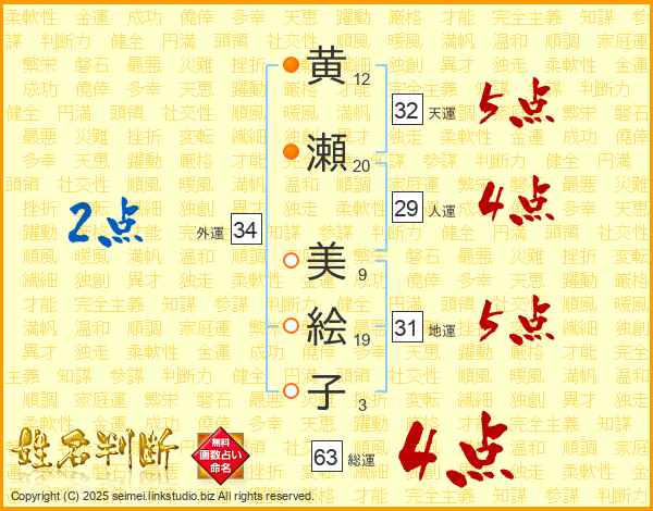 黄(12画)瀬(20画) 美(9画)絵(19画)子(3画)