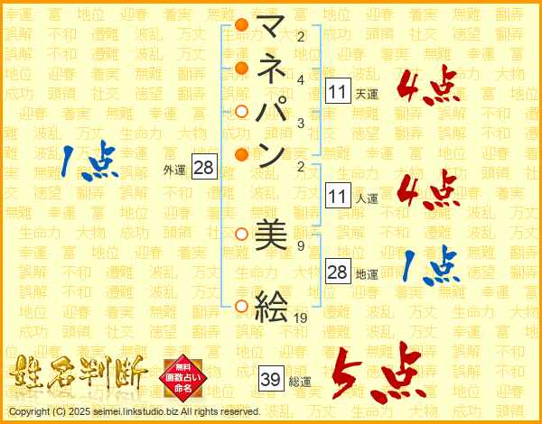 マ(2画)ネ(4画)パ(3画)ン(2画) 美(9画)絵(19画)