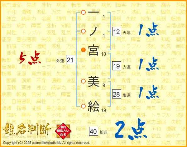 一(1画)ノ(1画)宮(10画) 美(9画)絵(19画)