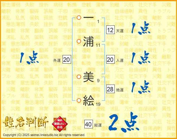 画数の奇数(○陽)と偶数(●陰)の配列で吉凶を占います。どちらかにかたよる名前は大凶名で避ける必要があります。画数の奇数偶数。