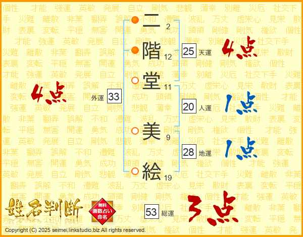 生活面を象徴する運勢です。外部から受ける影響力を表し、結婚運、家庭運や職場、環境への順応性を表します。総運から人運を引いた画数。姓や名が1文字の場合を除く。