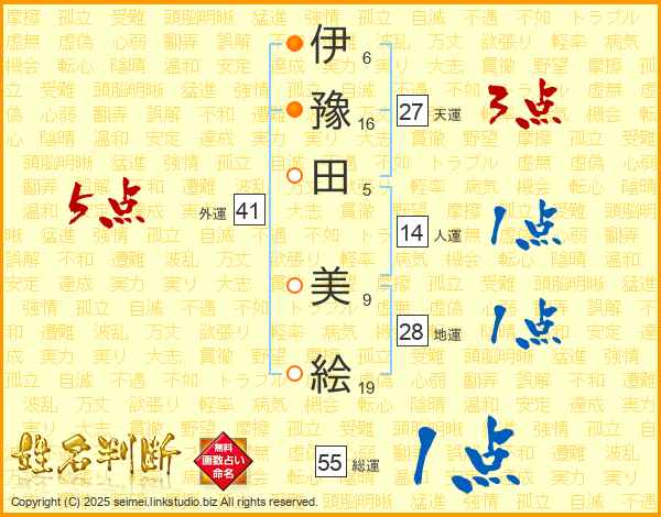 伊(6画)豫(16画)田(5画) 美(9画)絵(19画)