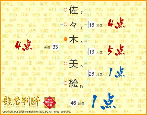 佐(7画)々(7画)木(4画) 美(9画)絵(19画)