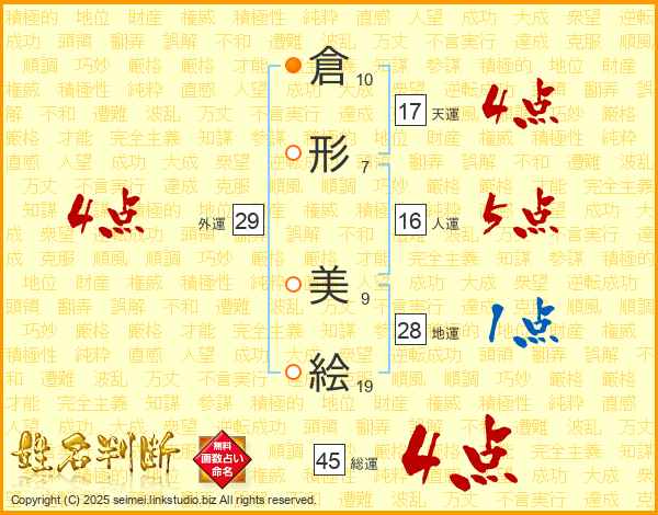 生活面を象徴する運勢です。外部から受ける影響力を表し、結婚運、家庭運や職場、環境への順応性を表します。総運から人運を引いた画数。姓や名が1文字の場合を除く。