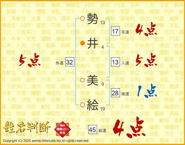 生活面を象徴する運勢です。外部から受ける影響力を表し、結婚運、家庭運や職場、環境への順応性を表します。総運から人運を引いた画数。姓や名が1文字の場合を除く。