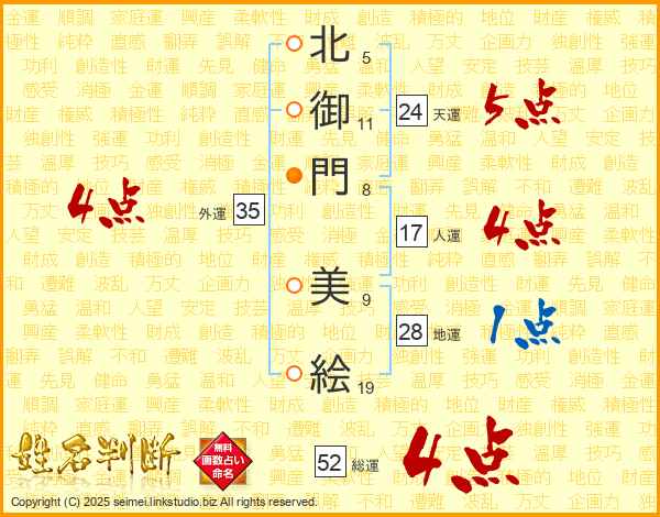 北(5画)御(11画)門(8画) 美(9画)絵(19画)