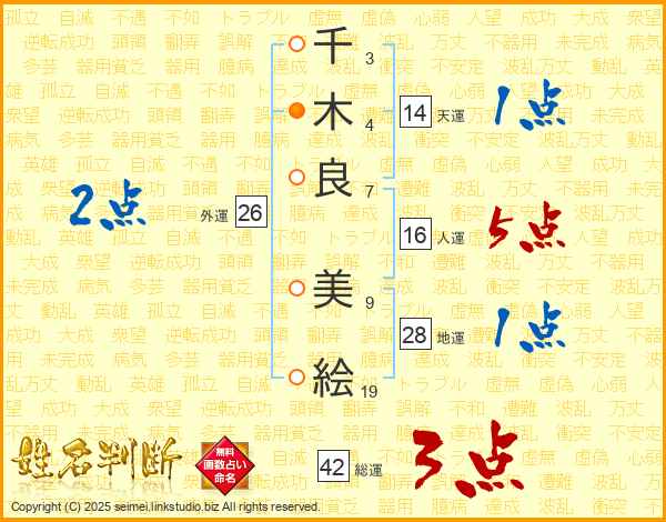 千(3画)木(4画)良(7画) 美(9画)絵(19画)