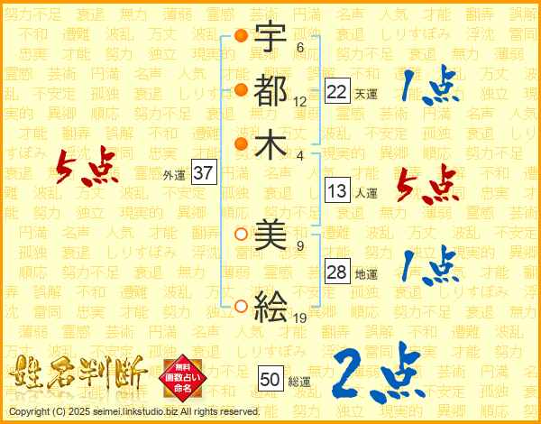 宇(6画)都(12画)木(4画) 美(9画)絵(19画)
