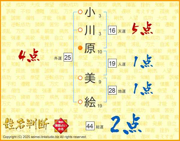 生活面を象徴する運勢です。外部から受ける影響力を表し、結婚運、家庭運や職場、環境への順応性を表します。総運から人運を引いた画数。姓や名が1文字の場合を除く。