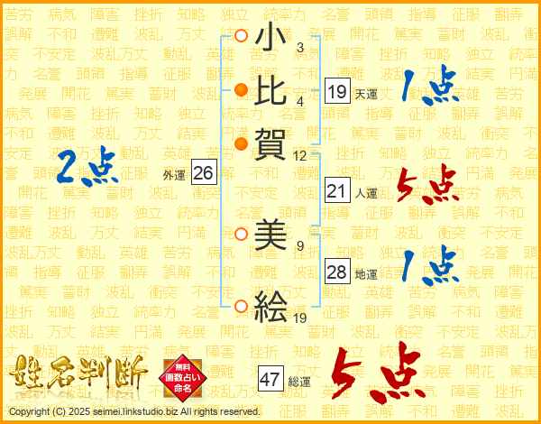 小(3画)比(4画)賀(12画) 美(9画)絵(19画)