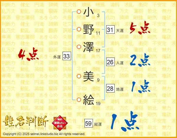 小(3画)野(11画)澤(17画) 美(9画)絵(19画)