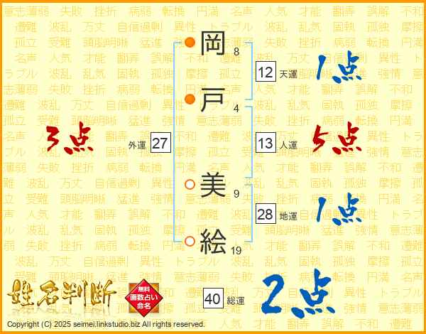 岡(8画)戸(4画) 美(9画)絵(19画)