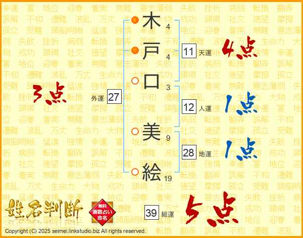 木(4画)戸(4画)口(3画) 美(9画)絵(19画)