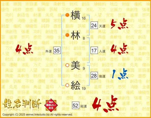 生活面を象徴する運勢です。外部から受ける影響力を表し、結婚運、家庭運や職場、環境への順応性を表します。総運から人運を引いた画数。姓や名が1文字の場合を除く。