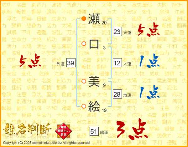 瀬(20画)口(3画) 美(9画)絵(19画)