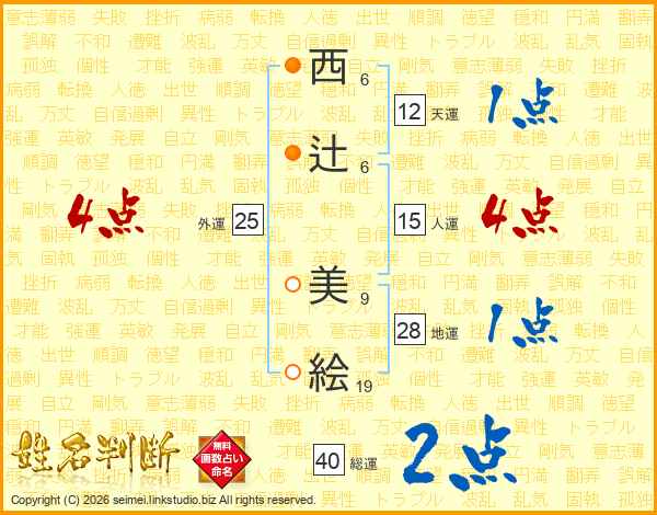 西(6画)辻(6画) 美(9画)絵(19画)