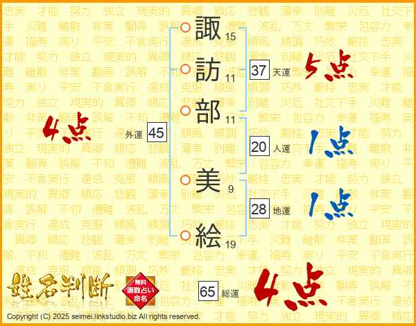 諏(15画)訪(11画)部(11画) 美(9画)絵(19画)