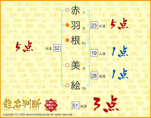赤(7画)羽(6画)根(10画) 美(9画)絵(19画)