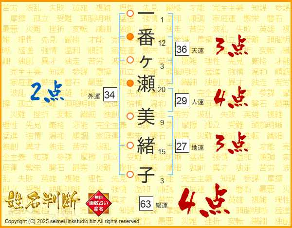 一番ヶ瀬美緒子さんの総運は63画の4点!
