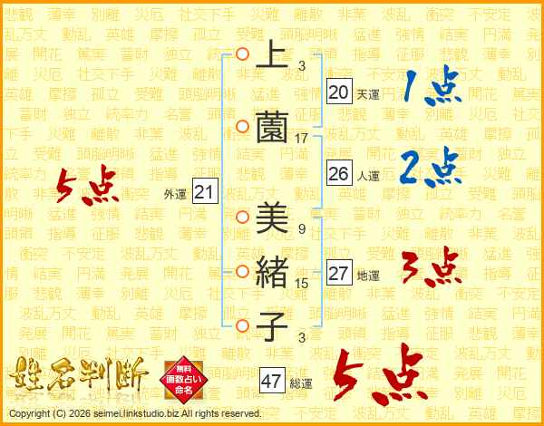 上(3画)薗(17画) 美(9画)緒(15画)子(3画)