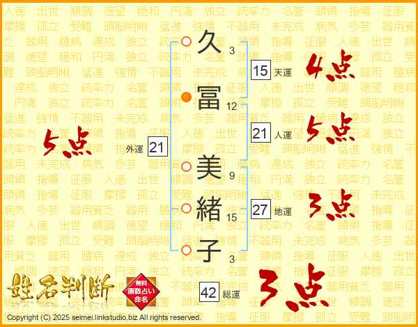 久(3画)冨(12画) 美(9画)緒(15画)子(3画)