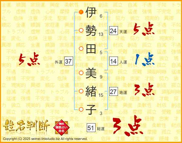 伊(6画)勢(13画)田(5画) 美(9画)緒(15画)子(3画)
