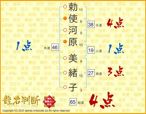 勅(11画)使(8画)河(9画)原(10画) 美(9画)緒(15画)子(3画)