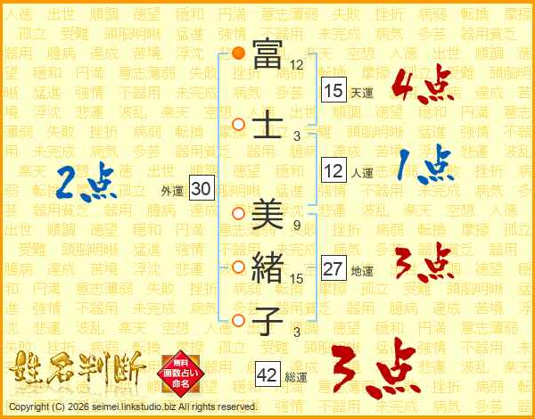 富(12画)士(3画) 美(9画)緒(15画)子(3画)
